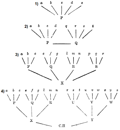 En ese libro, Jevons proporcionó cuatro diagramas separados que se muestran juntos en la Figura 8-A (ahora de dominio público) para guiar al lector paso a paso a través de un conjunto cada vez más conectado de bancos hipotéticos y cómo esta centralización se estaba produciendo a lo largo del tiempo. El primer diagrama mostraba cómo los titulares de cuentas de un solo banco podían enviarse dinero entre sí utilizando el banco como capa de liquidación. El segundo diagrama mostraba una conexión entre dos de esos bancos, que aceptan mutuamente los instrumentos de pago en papel para que sus titulares de cuentas también puedan enviarse dinero entre sí fácilmente a través de los bancos. El tercer diagrama mostraba la introducción de un banco central, lo que permitió una conciliación y liquidación más eficiente entre muchos bancos. El cuarto diagrama mostraba una cámara de compensación de capa base, ya sea a escala nacional o incluso a escala global, centrada en un importante centro financiero como Londres, para conectar a todos los bancos.